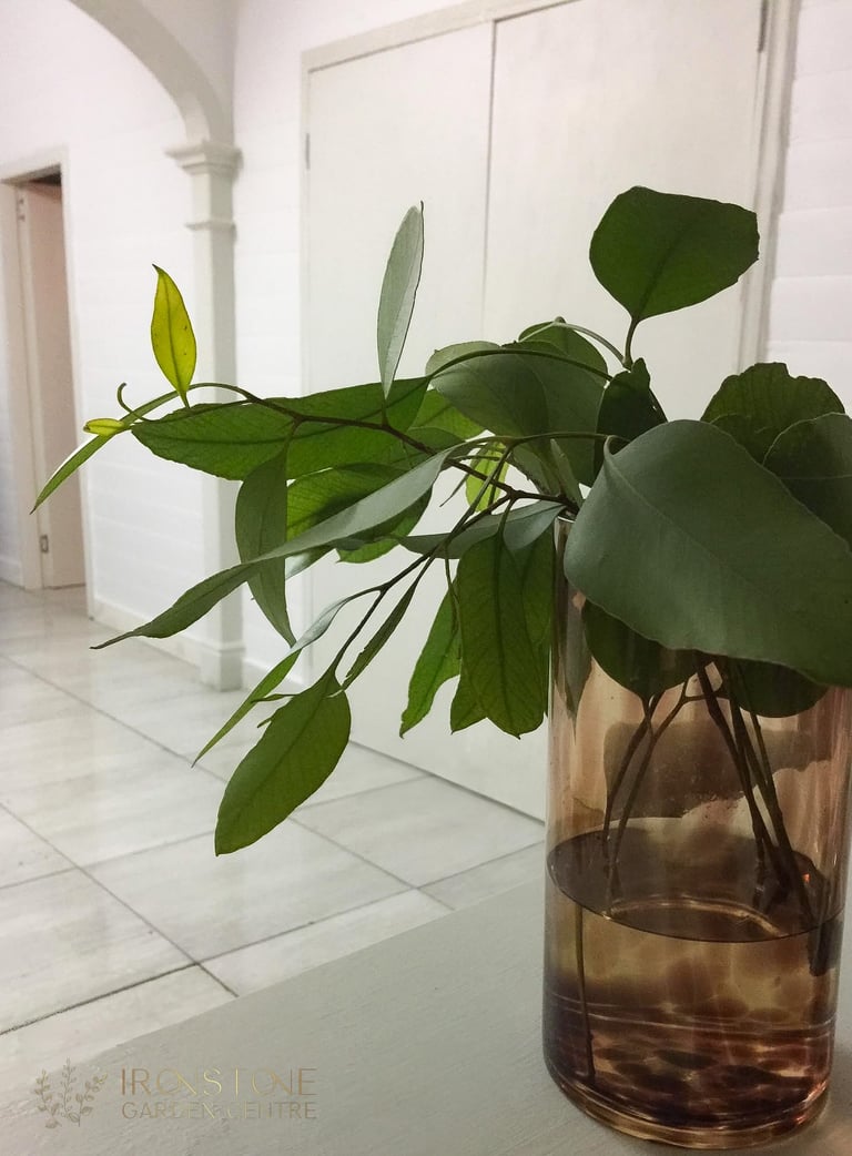 Eucalyptus branches, like many woody plants, contain dormant buds along their stems. These buds remain inactive under normal conditions but can be triggered by favourable changes in their environment. In this case, the availability of water and a stable indoor environment has signaled these buds to activate, resulting in the fresh, pale green leaves now visible. These leaves are particularly tender and vibrant, a stark contrast to the tougher, more mature leaves typically found on a tree.