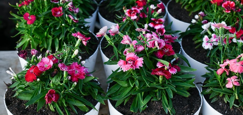 White self-watering pots further stabilise soil temperature and moisture, ensuring healthier roots and more resilient plants.
